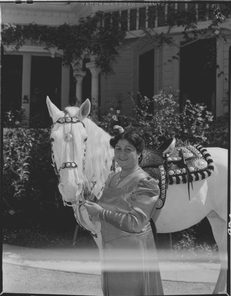 Sunset ad. - Carmen Camarillo on horse - long shot. [the horse is a palamino and the saddle and stirrups are very ornate. She is posed in front a 3-story Victorian mansion].