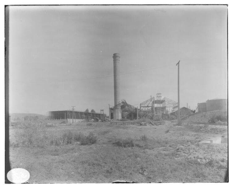 Los Angeles #3 Steam Plant while under construction, specifically showing the construction of the cooling tower reservoir.