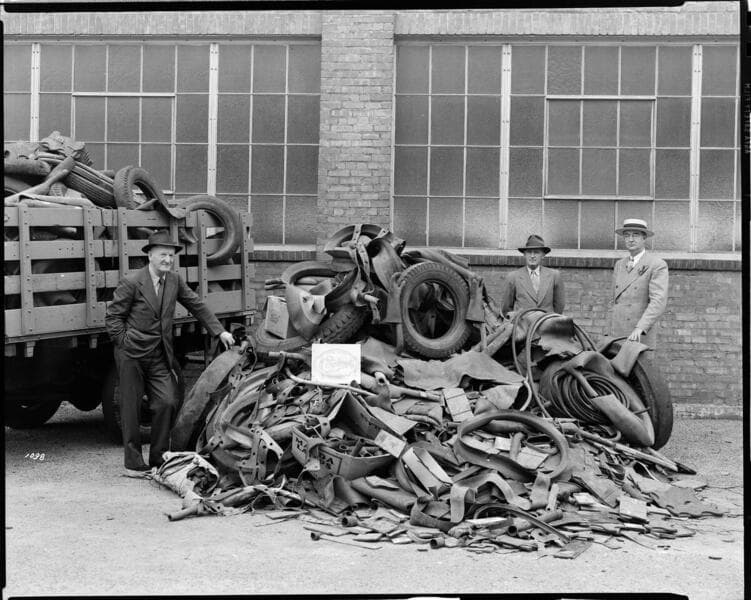 Edison Scrap Drives - A man by a pile of non electric irons turned to edison, Iverson in background