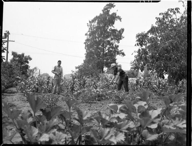 The wife and daughter of Edison employee J.C. Phipps, who was away on active duty, tend their Victory Garden at home in Whittier in 1942.