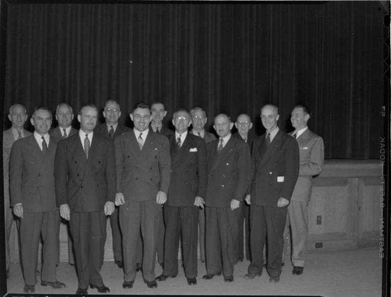 Commercial Misc., Home Planners Institute - (names with negatives). (Fullerton, Santa Ana, Huntington Park). [four men in office with "Home Planning File"]. [variant of 05-51175]