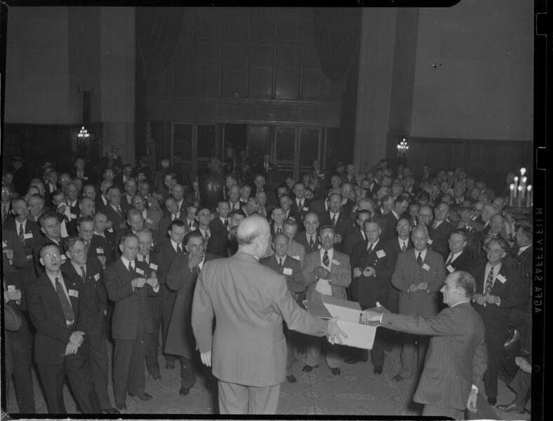 People mixing after or before Diamond Club banquet. Man with moustache is J. "Jake" Maier Sr.