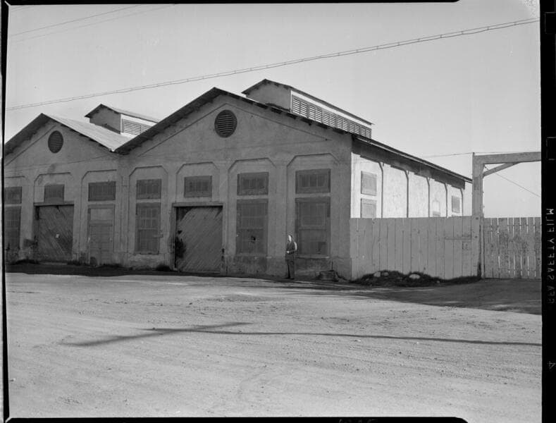 Miscellaneous. - Edison Landmarks - Transportation Dept. - Old L. A. Plant #3, and main garage. [Negative has tape residue on acetate side. Could be cleaned. This is a rare shot of the Los Angeles Plant #3.]