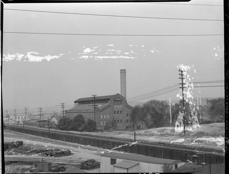 Miscellaneous Facilities - Los Angeles - General Garage - general view. [Los Angeles Steam Plant in upper left corner of shot].