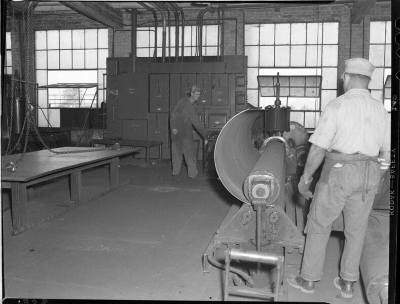 Big Creek 2A Pipe fabrication (3497-A). Rough forging of section of pipe for 2A penstock ready for machining.