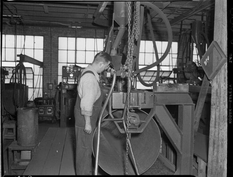 Big Creek 2A Pipe fabrication (3497-A). Rough forging of section of pipe for 2A penstock ready for machining.