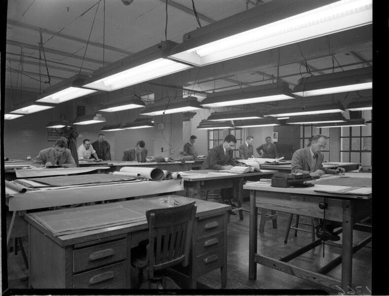L1.1 - Lighting, misc. - Industrial Lighting - Drafting Room of Vultee Aircraft (after) - Downey.