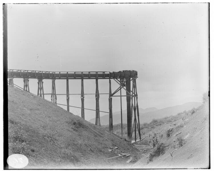 The raceway flume joining the tailrace of Mill Creek #2 Hydro Plant and Mill Creek #3 Hydro Plant with the intake of Mill Creek #1 Hydro Plant. [showing the mountains and the canyon.]