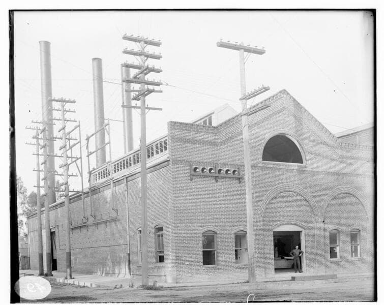 The Los Angeles #3 Steam Plant while under construction, showing a man sitting in the doorway of a building in front of the steam plant, and the stack and transmission lines.