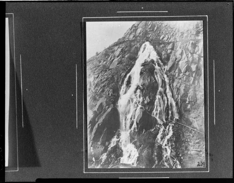 An album with 79 amateur and commercial photographs of landscape views of the San Joaquin River area in Fresno County, California, showing sites related to development and early construction of the Pacific Light and Power Company's power plant. The photographs appear to document the promotion of the Mammoth Power Company and the Pacific Light & Power Company's Big Creek projects, along with views of engineers or survey parties in the field and scenic panoramas. The accompanying photograph legend identifies some of these as dam sites and reservoir sites. Local landmarks shown include San Joaquin Canyon, Kerckhoff Dome, several waterfalls along the river, Ray City camp, and Jackson's Bridge on Big Creek. Some of the photographs show landscapes covered with snow. There is one photograph of a Native American woman with a child.