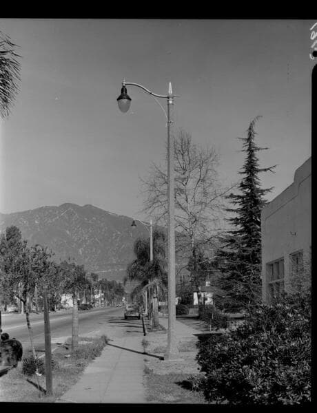 Lighting, Street - old standard, Covina - before. [Street Light standard was poured with a notice embossed in the base: "Hitching Prohibited by Ordinance".]