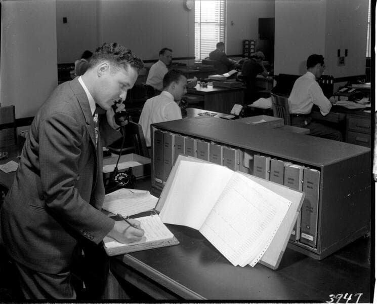Personalities - Pay Roll Division [man scratching his head behind a four foot stack of documents].