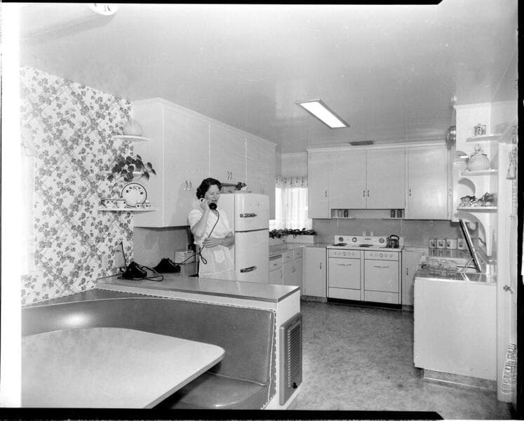 [residential kitchen with woman on phone]