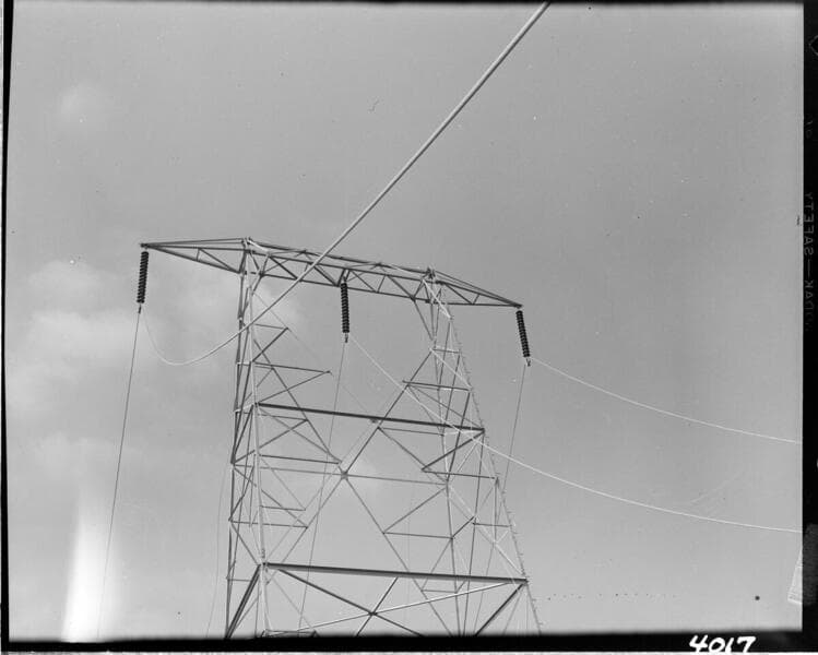 Men hanging from tower crossarm stringing conductor