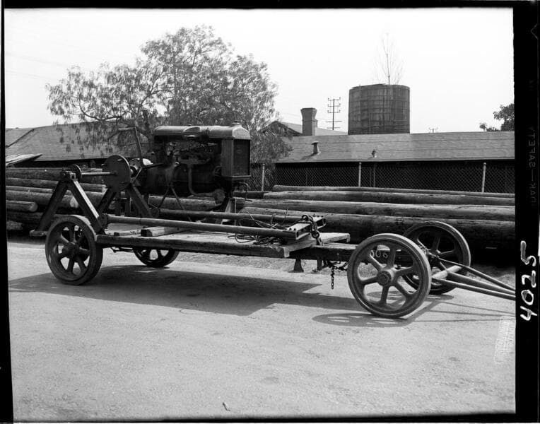 "Take Off" loading poles on "dolly" at the Whittier Railroad Station. derrick with trailer.
