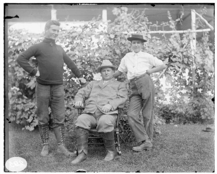 Three men posed in residential garden; the man seated is Ben Pearson. Two of them are wearing snakebite leggings. (Pearson family photo?)