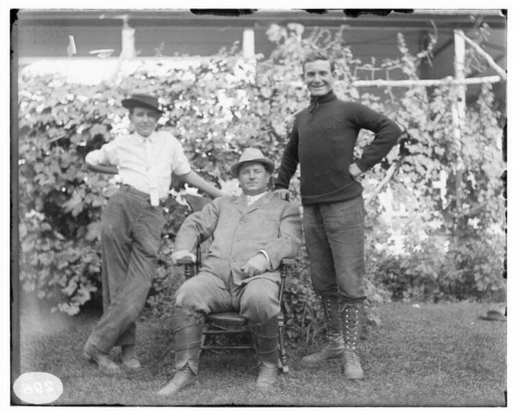 Three men posed in residential garden; the man seated is Ben Pearson. Two of them are wearing snakebite leggings. (Pearson family photo?)
