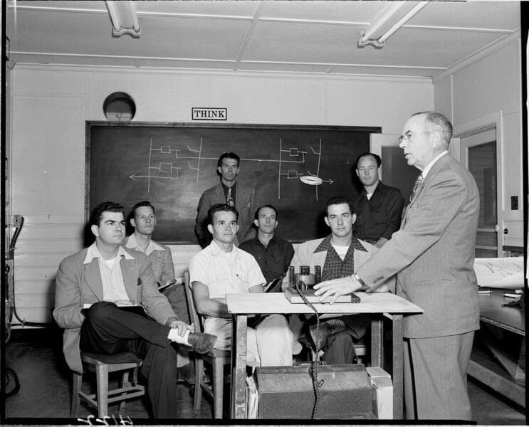 Apprentice Training - Substation operators - man at board. [sloppy log entry is barely readable]