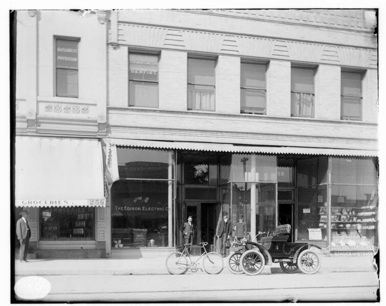 Three men standing next to the switchboard and generators in Mill Creek #1 Hydro Plant