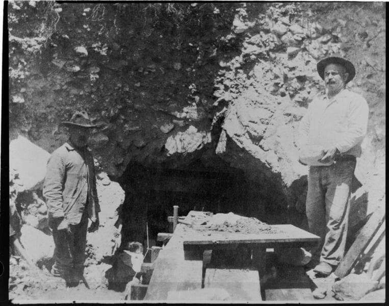 Tunnel construction on Mill Creek #3 Hydro Plant line. A member of the construction crew is standing in the tunnel.