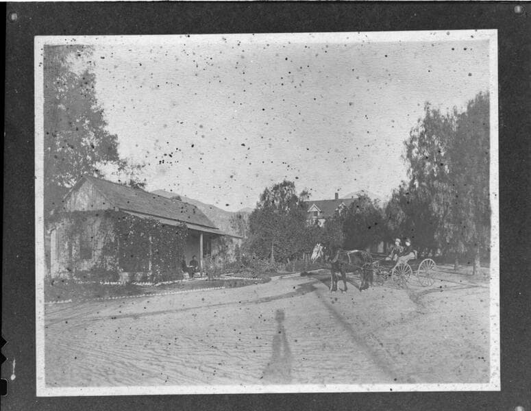 The delivery of material by horse drawn wagon to the building of Santa Ana River #1 Hydro Plant, ca. 1898.