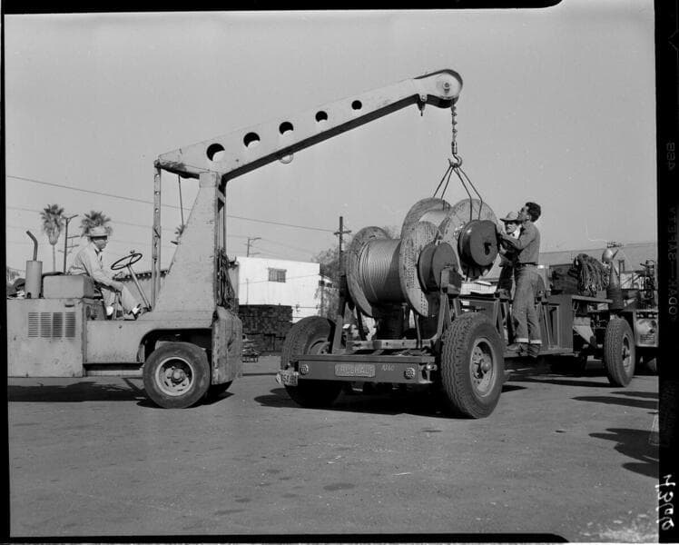 Loading conductor spools onto trailer with small crane.