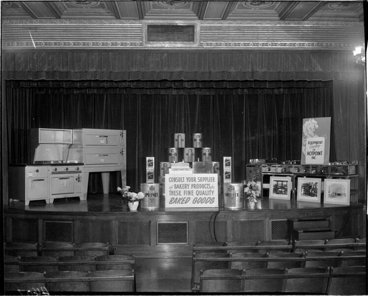 Commercial Hotpoint fryers and enlarged photos of their restaurant use on the stage the G.O. auditorium