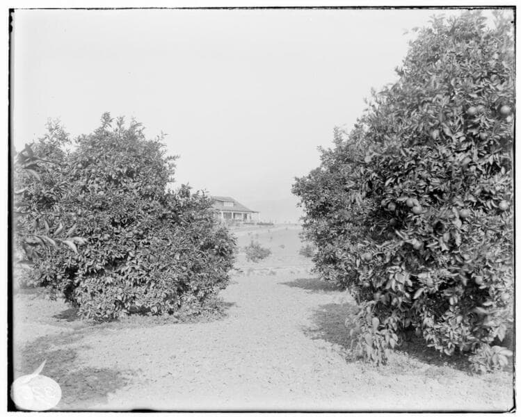 A grove of orange trees with a house in the background. A man is standing in the front right corner.