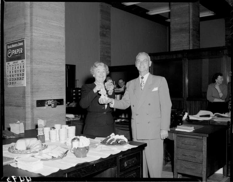 Man pinning corsage on lady in office.