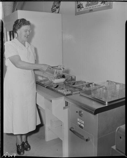 Lee's hamburger - view of cook grilling burgers while two women watch over the counter.