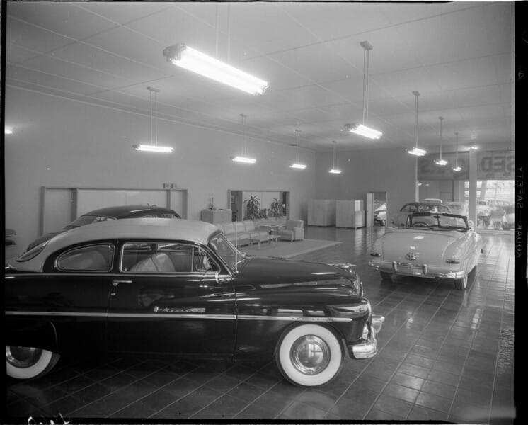 View of the showroom of the Lincoln Agency at 350 West Colorado. Vehicles are widely spaced on a tile floor, with ferns on small stands around the room.