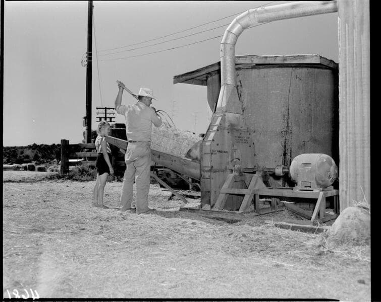 Farmer feeding bales of hay into shredder with daughter standing by