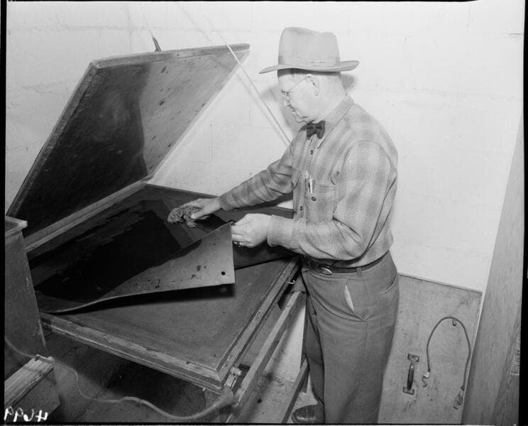 Man and woman looking at a Weatherton Air Conditioning unit ("heats without flame, cools without water").