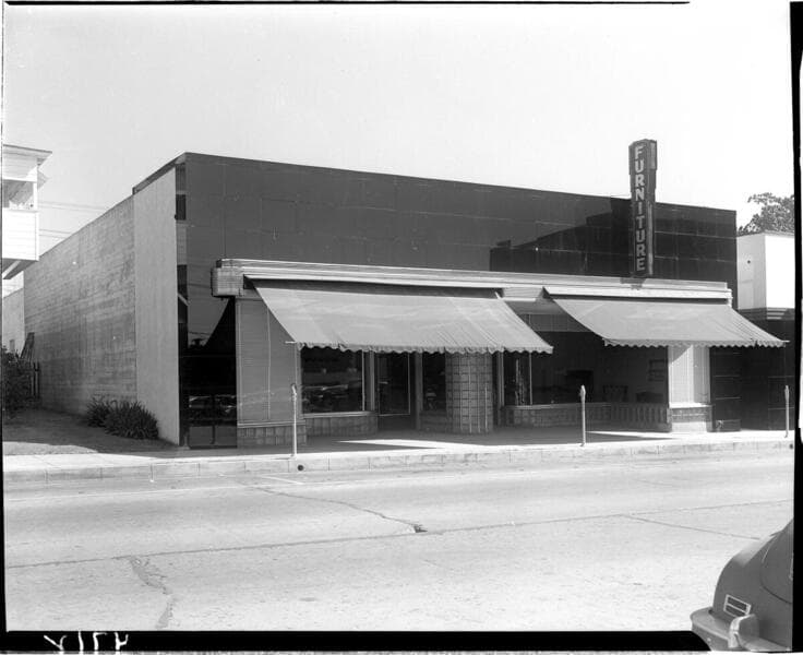 Views of furniture on display in Green & Hinkle store. Includes one exterior of store on Wilshire Boulevard, one view of the selling floor, and one photograph of carpet samples.