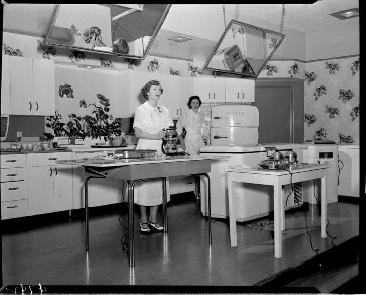 People in audience at cooking demonstration in model kitchen