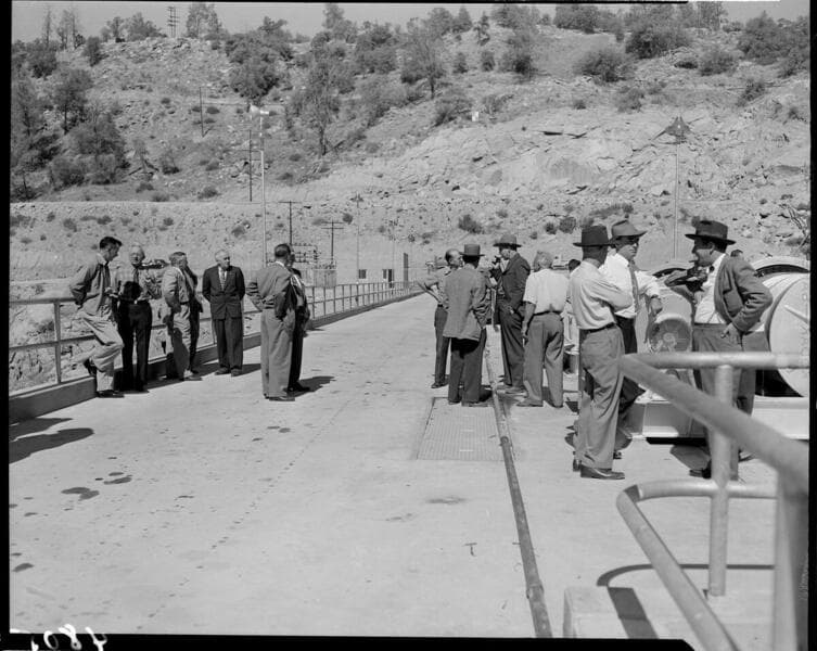 Crowd of people on the crest of Dam 7 touring the dam probably during the dedication of the Big Creek 4 project