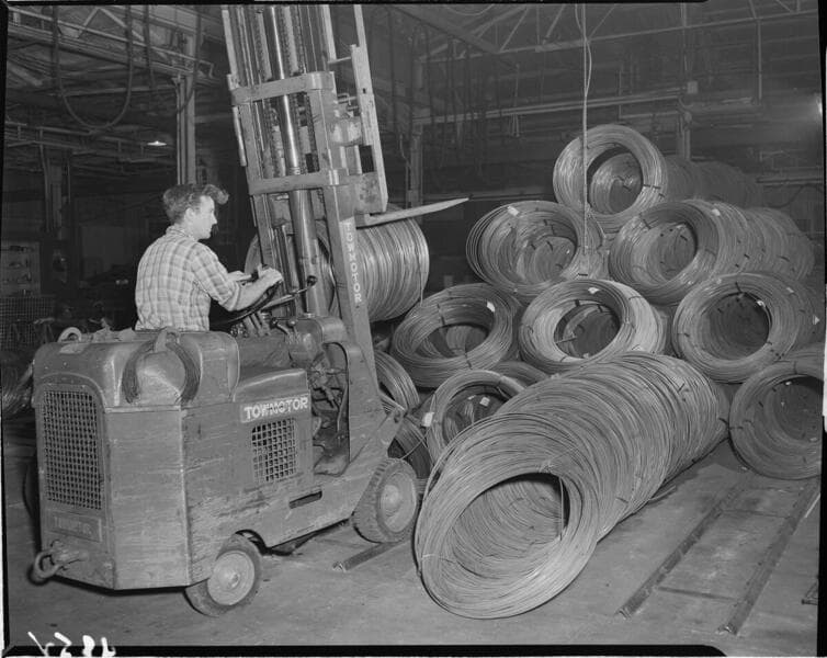 Man moving coils of wire with power fork lift
