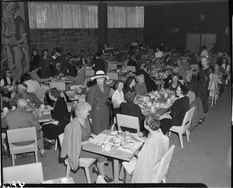 Buffum's department store - interior - fashion show around lunch tables.