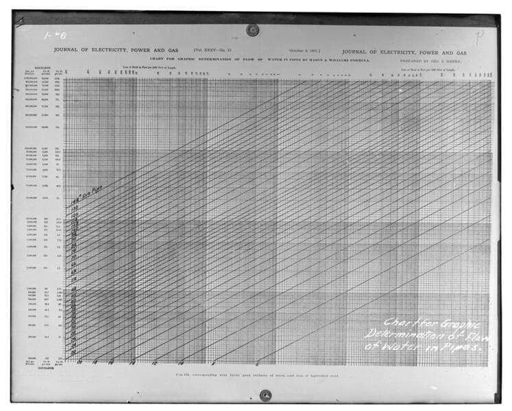 Chart for graphic determination of flow of water in pipes. - By Hazen & Williams Formula C=80