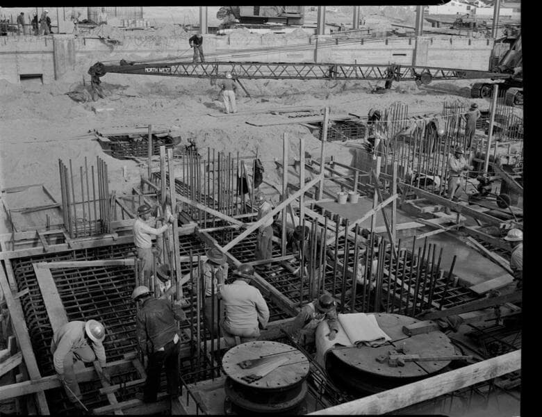 Redondo Beach Steam Station - Plants 2-5 - Looking west showing screenwell cofferdam and screenwell mat reinforcing steel.