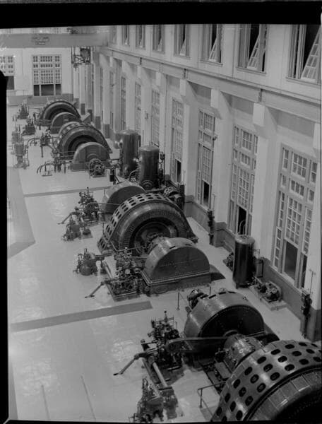 Kern River No. 3 - Interior shot the generator floor at Kern 3 Powerhouse, with two Francis type turbine