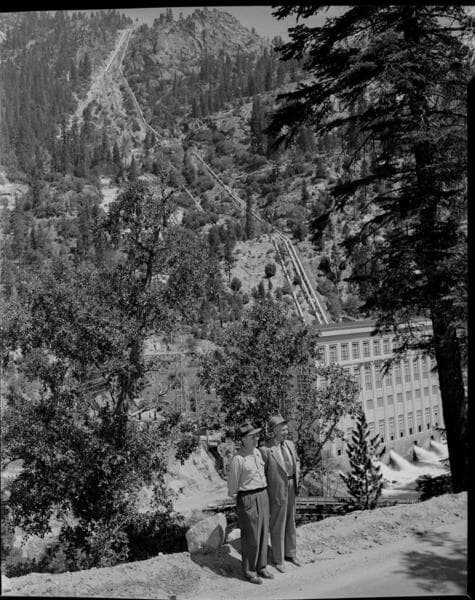 Dave Redinger (in suit and hat) standing near the tailrace at Powerhouse #1.