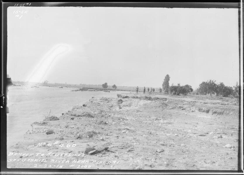 Transmission Line - Eagle Rock to Kern Substation (#5 West Kern Line) Pole Line washout. -Showing conditions after flood at Salt Lake R.R. Bridge over Arroyo Seco at Cypress Ave., Los Angeles. Taken from North bank of Arroyo looking upstream.