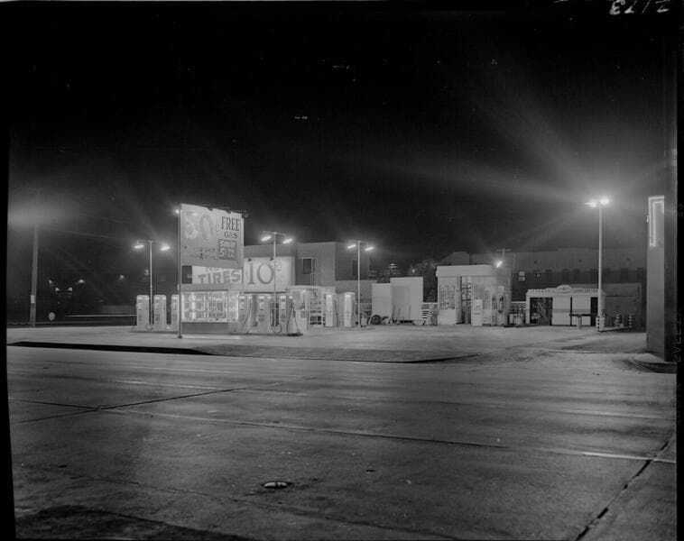 L1.6 - Lighting, service stations - Charles L. Brown "Brownie's Day & Night" Service Station. 3126 E. Florence Ave., Huntington Park, at night.
