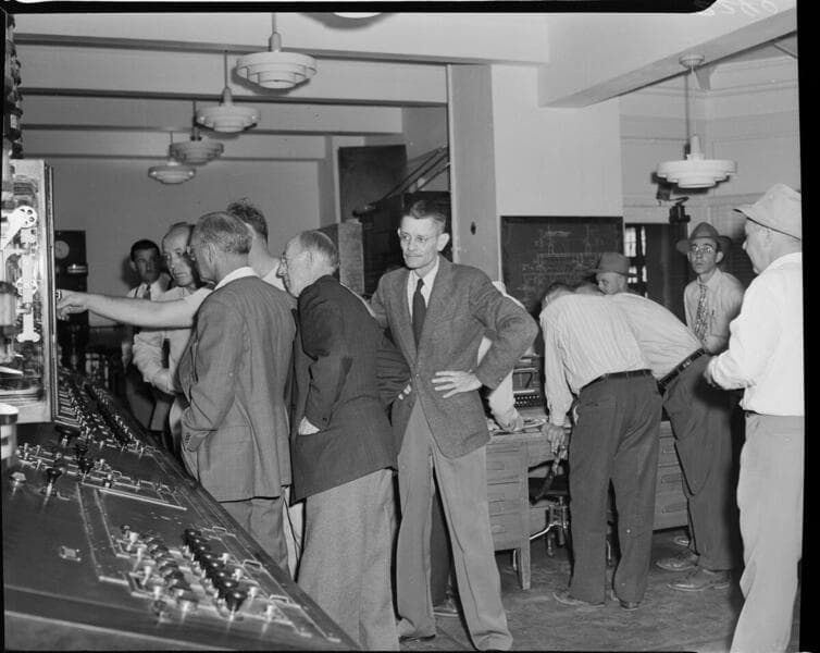 Big Creek Valley Editors Tour: group touring Powerhouse control room