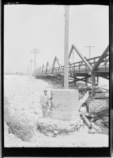 Transmission Line - Eagle Rock to Kern Substation (#5 West Kern Line) Pole Line washout. -Showing conditions after flood at Salt Lake R.R. Bridge over Arroyo Seco at Cypress Ave., Los Angeles. Taken from North bank of Arroyo looking upstream.