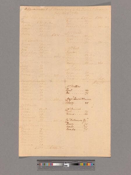Autograph document, in hand of Washington. List of enslaved persons designated for the Dismal Swamp Land Company project by its members, including monetary value attributed to each; includes the following enslaved persons from Washington's estate: Harry, Jack, Cæsar, Topsom, Nan, and Toney, a boy. (1 page)