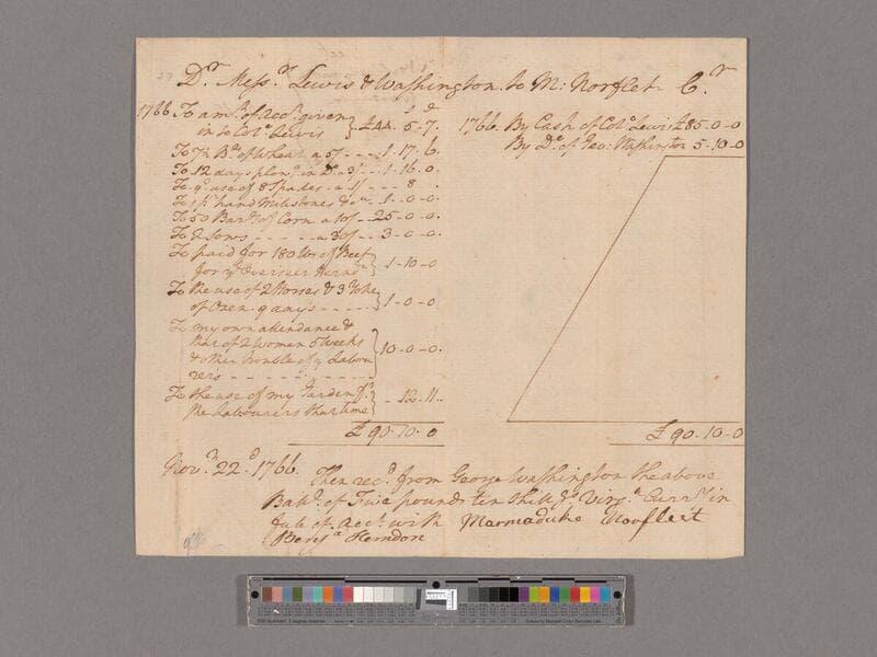 Receipted bill of items sold and rented to Lewis and Washington by Marmaduke Norfleet