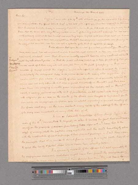 Autograph letter signed. Marginal note by McHenry. (1 page) Includes copies of letters to Washington from James Madison (1783 April 29) (1 page) and Robert R. Livingston (1783 May 2) (1 page) in the hand of Martha Washington, endorsed by George Washington.