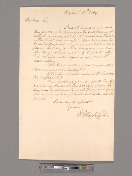 Autograph letter signed. Marginal note by McHenry. Includes copies of letters to Washington from James Madison (1783 April 29) and Robert R. Livingston (1783 May 2) in the hand of Martha Washington, endorsed by George Washington.